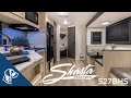 The 2026 Shasta i-5 Edition 527BHS is a lightweight, 31' 2" travel trailer with a family-friendly bunkhouse floorplan that sleeps up to 8 people, featuring a large slide-out, exterior kitchen, and double-size bunks. It has a dry weight of approximately 5,664 lbs, a GVWR of 7,515 lbs, and features a rear corner bath, private front bedroom, and a 39-gallon fresh water tank.